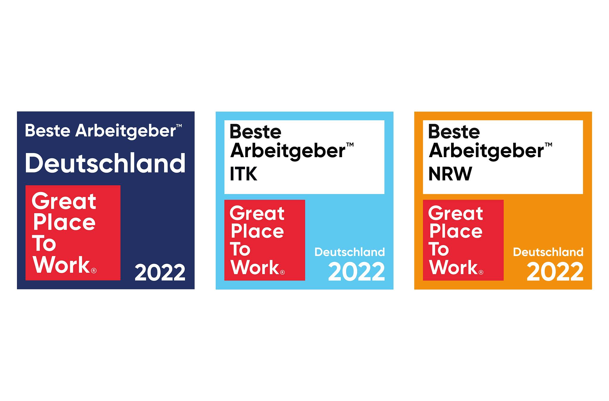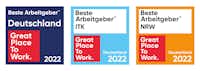 Vi är stolta över att officiellt ha tilldelats utmärkelsen "Tysklands bästa arbetsgivare 2022" av det oberoende institutet Great Place to Work®. Vi kan dessutom glädja oss åt ytterligare två utmärkelser – som en av de 20 bästa arbetsgivarna i Nordrhein-Westfalen (NRW) samt inom informations- och kommunikationsteknik (ITK).