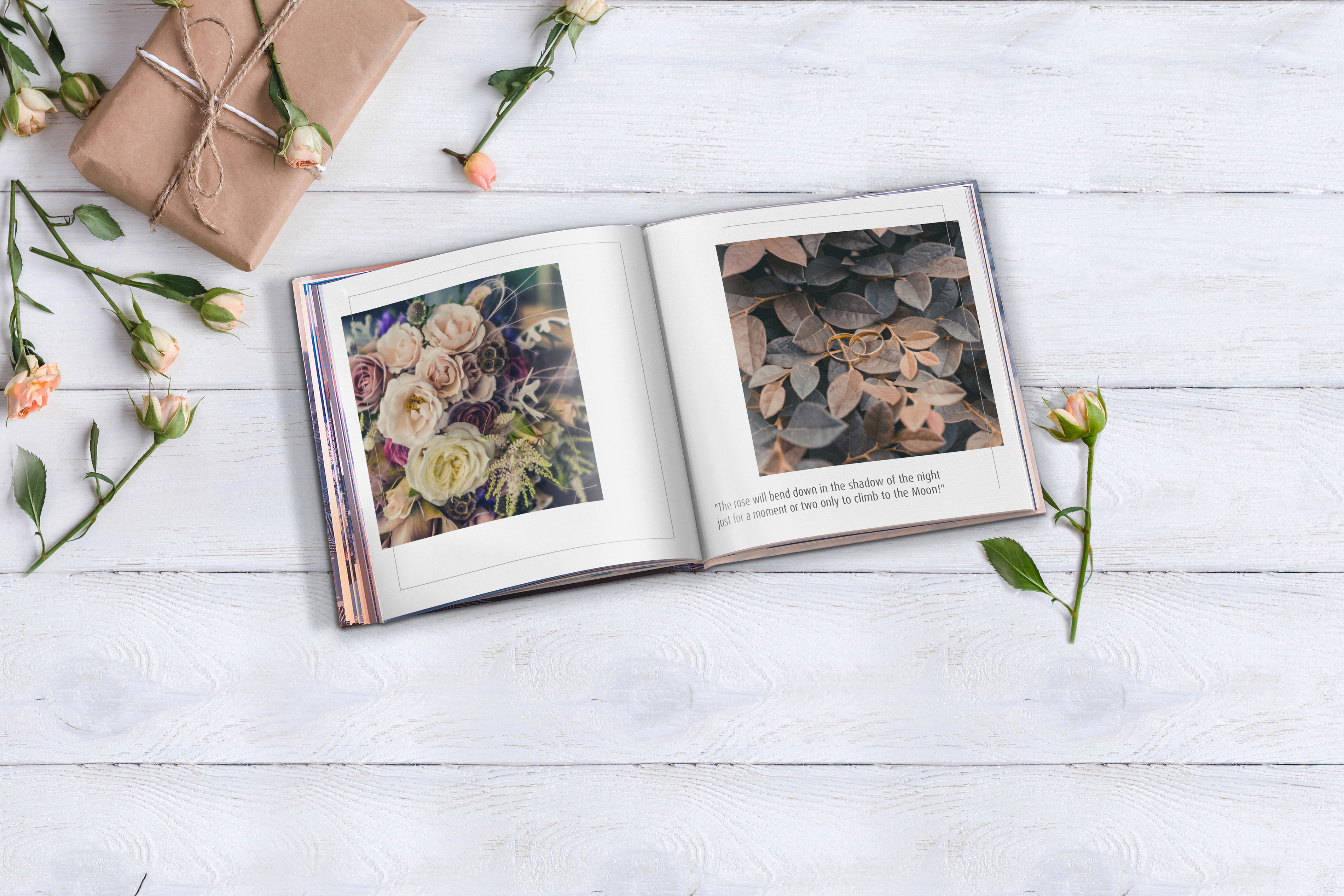 Ett bröllop förtjänar ett särskilt fotoalbum med en personlig lyckönskning. Använd de finaste gemensamma fotona om du vill ge brudparet albumet i present. Självklart kan du också skapa ett album med de finaste fotona från bröllopet, inklusive gruppfoton och foton på de nygifta i stort format. För bröllopsalbum passar ett hårt omslag med layflat-bindning särskilt bra eftersom de visar upp dubbelsidiga bilder på bästa sätt.